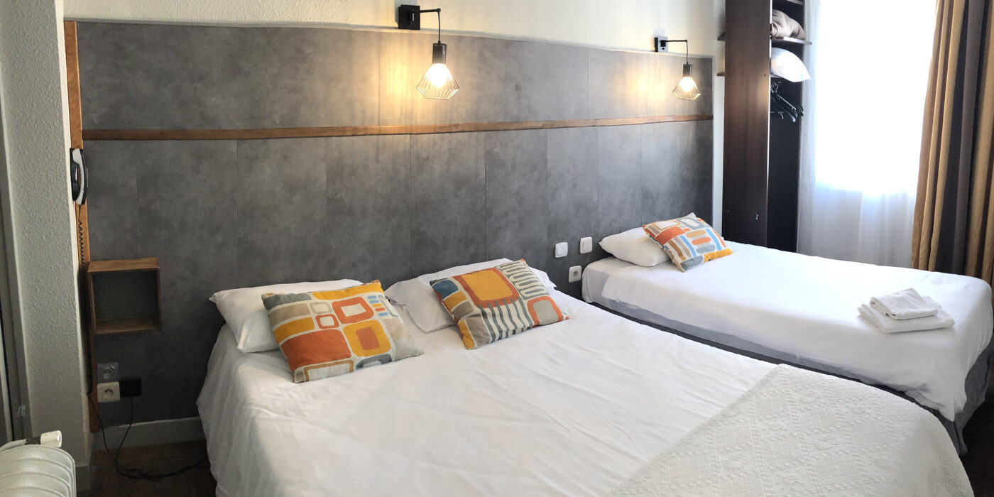 Nos autres chambres Chambre Double Voir les détails Chambre Quintuple Voir les détails Chambre Quadruple Voir les détails Détails Invités: 3 Vue : Rue Taille : 50m² Type de lit : Lit double et un lit simple Équipements :Climatisation réversibleFer à repasser avec sa table (sur demande)Parkings disponibles (sur réservation)Salle de bain privative avec douche ou baignoireSèche-cheveux (sur demande)TélévisionToilettesWifi gratuit dans tout l'hôtel